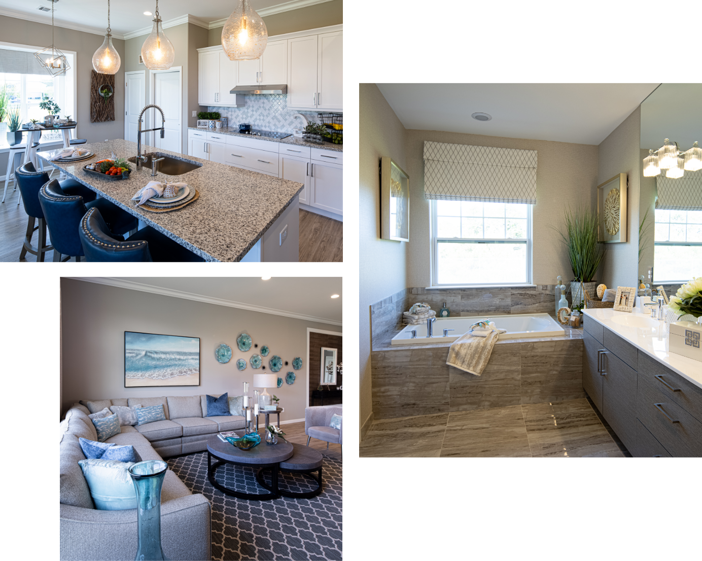 These luxurious new homes come with up to 6 bedrooms and 4 ½ bathrooms. Primary bedroom suites feature large bathrooms with twin sinks, tub, separate stall showers and his & her walk-in closets. Designer kitchens include granite counter tops and stainless-steel GE appliances.